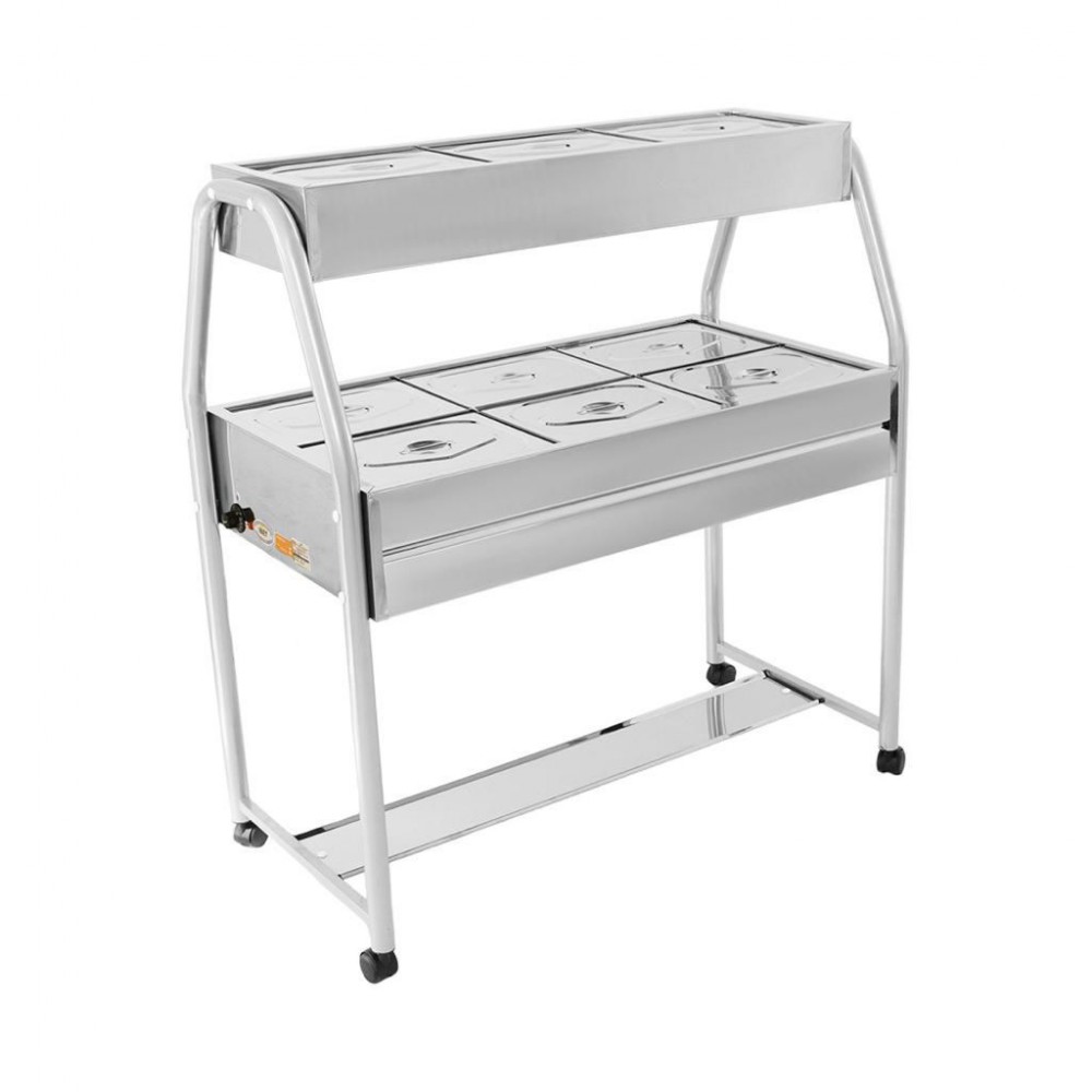 Construído em aço inox escovado, cubas gastronômicas (GNs) em aço inox AISI304, rodízios com trava, protetor salivar em vidro 8mm, corre pratos em aço inox tubular escovado AISI304.